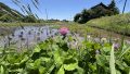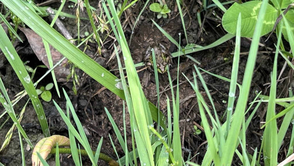 ビオトープには里芋が芽を出して、殿様が見に来てました。スイレンさんが二つ咲いていました。はすの葉っぱも伸びて来ました。